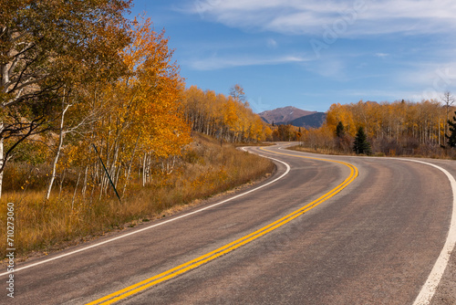 Fototapeta premium Winding road among trees with autumn golden foliage