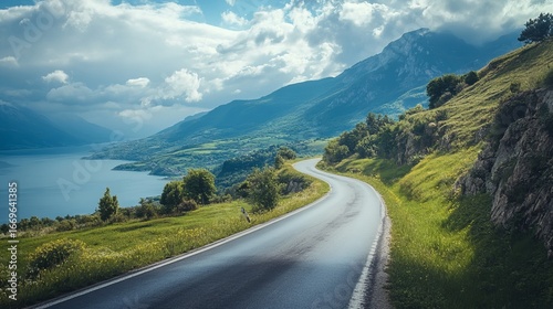 © Seventh, Fototapeta premium Winding road ascends a hillside overlooking a tranquil lake, mountain backdrop