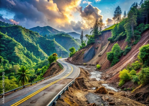 Naklejka premium Winding Road Blocked by Landslide Debris - Nature Disaster