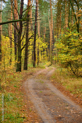 © Ryzhkov Oleksandr, Obraz premium Winding Road in Autumnal Pine Forest