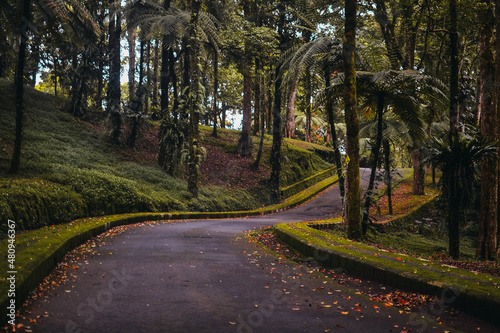 © kshk, Naklejka premium winding road in the autumn forest among the palm trees
