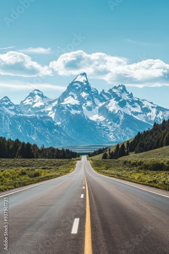© BrandwayArt, Naklejka premium Winding road leads to majestic snow-capped mountains in daylight