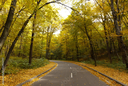 © Sasha, Obraz premium Winding road passing through the autumn forest. Empty forest road, littered with autumn leaves.