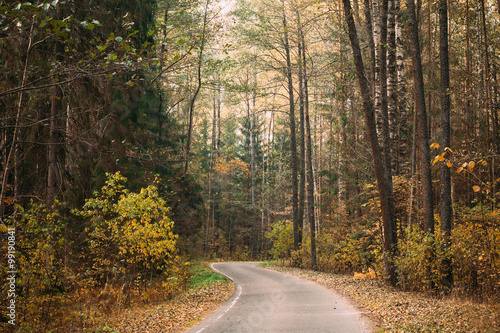 © Great Brut Here, Fototapeta premium Winding road path walkway through autumn forest