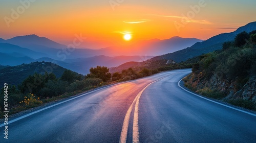 © MBRAMO, Fototapeta premium Winding road sunset mountain landscape, travel scenic