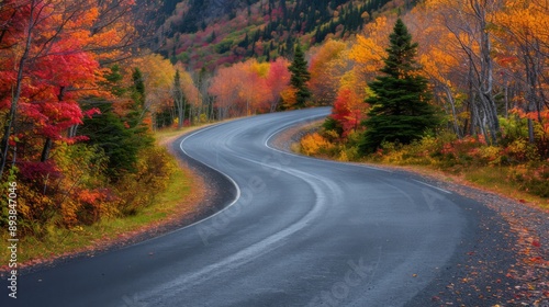 © AlfaSmart, Obraz premium Winding road surrounded by vibrant autumn foliage