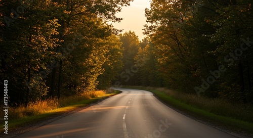 © Kapten, Fototapeta premium Winding road through a forest at sunrise or sunset with sunlit trees