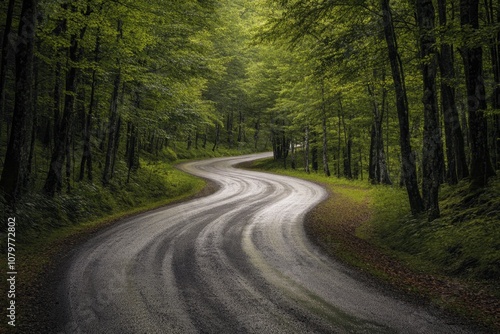 © Art Jabz, Fototapeta premium Winding road through a lush green forest.