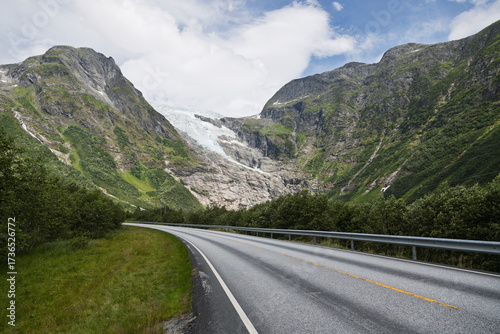 © DBA, Naklejka premium Winding Road Through a Majestic Glacial Mountain Valley Under a Cloudy Sky