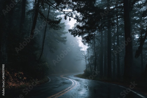 Obraz premium Winding road through a misty forest in early morning light creating a serene...