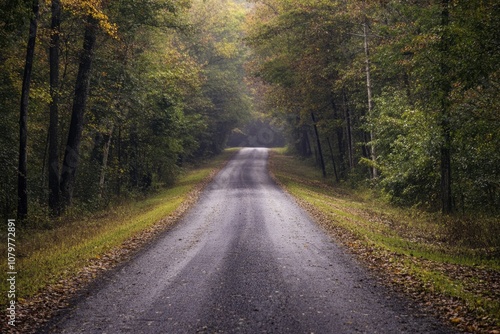 © Abdul, Fototapeta premium Winding road through a misty forest in fall.