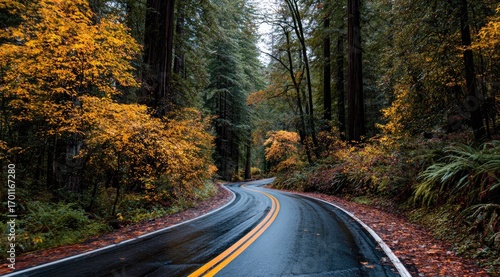 © Iksan, Obraz premium Winding road through a redwood forest in autumn. Yellow and orange leaves line a wet asphalt road, leading into a dense canopy of tall trees