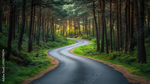 Fototapeta premium Winding road through a serene forest in golden light during the late afternoon
