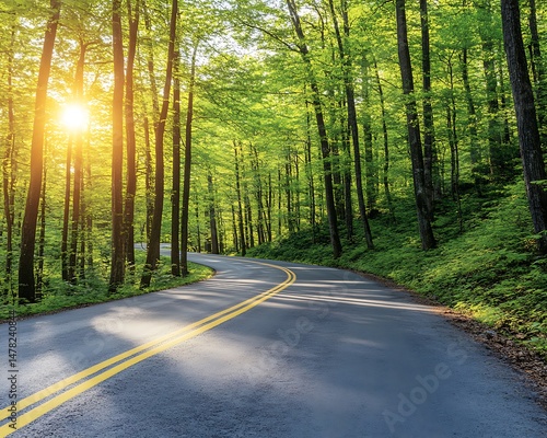 © Al, Obraz premium Winding road through a sunlit forest