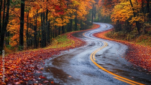 © Kitanari, Obraz premium Winding road through autumn forest, rainy day. Travel postcard