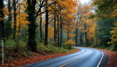 Obraz premium Winding road through autumn forest with colorful foliage on trees and ground...