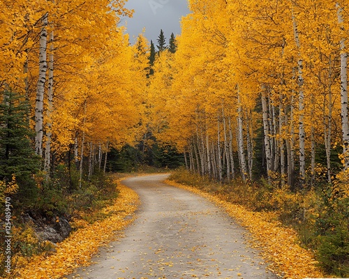 © Awwa, Obraz premium Winding road through autumnal golden aspen trees.