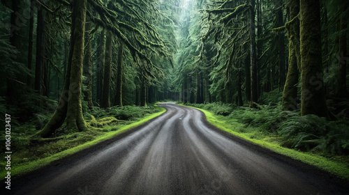 Naklejka premium Winding road through dense, lush green forest with tall moss-covered trees...