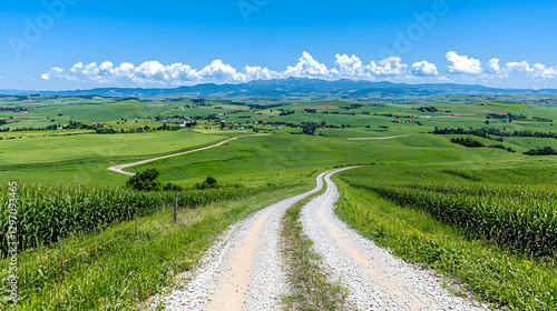 © KIMEHIME, Fototapeta premium Winding road through green farmland, scenic mountains background, summer day, travel photography