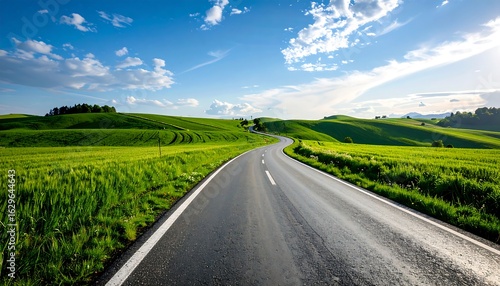 © Goreng, Fototapeta premium Winding road through green fields under a vibrant sky