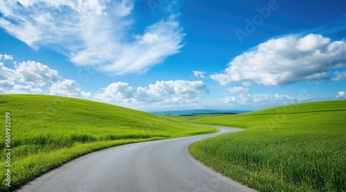 © irwan, Fototapeta premium Winding road through green hills under a bright sky