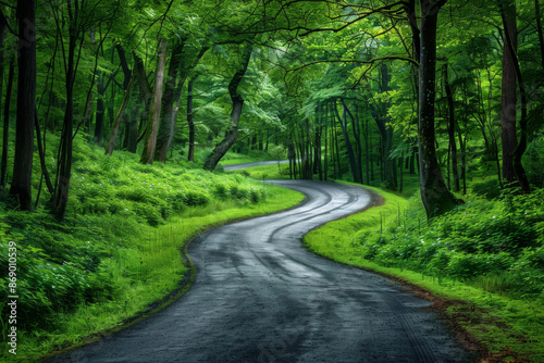 Naklejka premium Winding Road Through Lush Green Forest