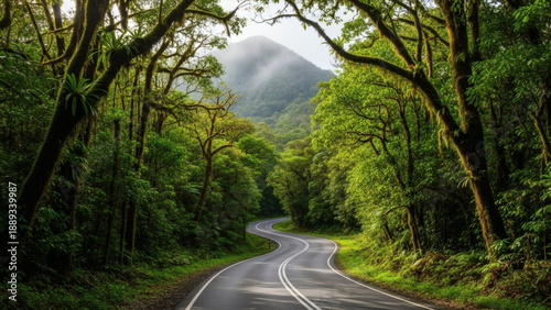 Obraz premium Winding Road Through Lush Green Forest with Trees and Mountain in Distance