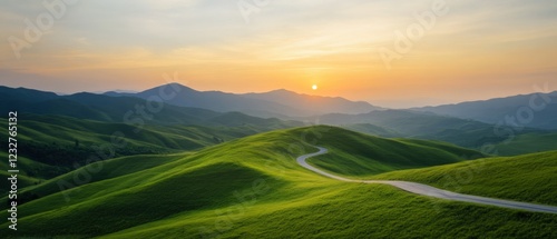 © Priya, Fototapeta premium winding road through lush green hills at sunset