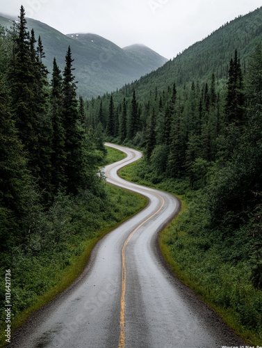 Fototapeta premium Winding road through lush green mountains on a rainy day