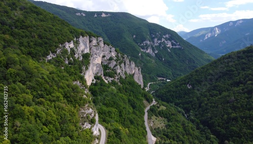 © Nadyaaretha, Naklejka premium Winding road through lush green mountains with steep, rocky cliffs