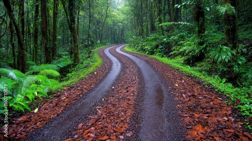 © Zaenal, Fototapeta premium Winding road through lush rainforest, wet leaves on the ground.