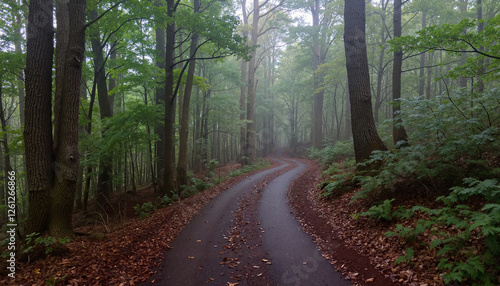 © Mikhael, Obraz premium Winding road through misty forest