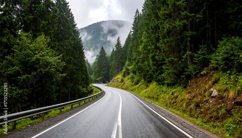 © Farti, Fototapeta premium Winding road through misty forest
