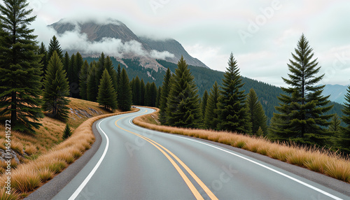 Fototapeta premium Winding road through misty mountains and evergreen trees, nature's beauty