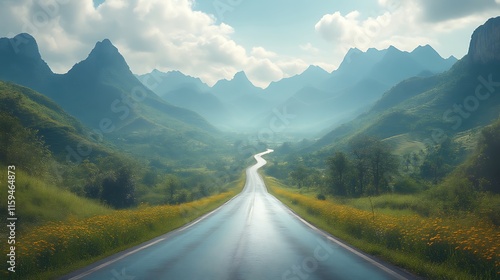 Fototapeta premium Winding road through misty mountains and green fields.