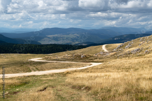 © slobodan, Fototapeta premium Winding road through mountain landscape, distant mountain ih haze and cloudy sky