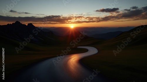 Fototapeta premium Winding road through mountains at sunset. A picturesque, sweeping road winds...
