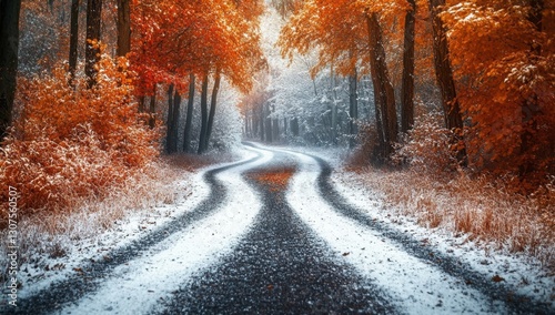 Fototapeta premium Winding Road Through Snowy Autumn Forest