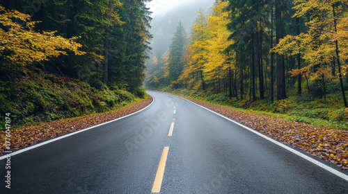 Fototapeta premium Winding road through tranquil forest with vibrant autumn foliage and misty...