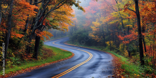 Fototapeta premium Winding road through vibrant autumn foliage in misty forest, showcasing...