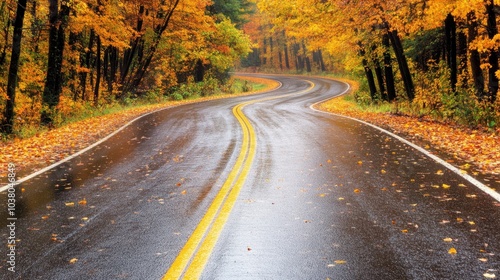 Fototapeta premium Winding road through vibrant autumn forest with colorful leaves. Concept: scenic fall journey.