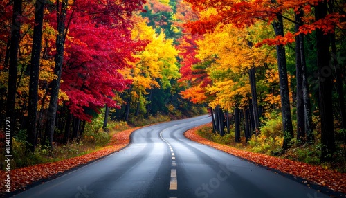 Obraz premium Winding Road Through Vibrant Autumn Forest with Colorful Trees.