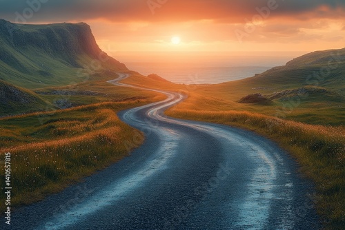 Fototapeta premium Winding scenic road at sunset coastal landscape photography serene wide angle view nature's beauty