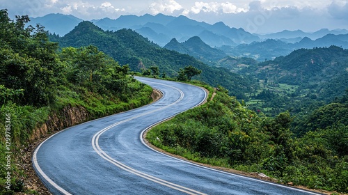 © Pitch Aya, Fototapeta premium Winding Scenic Road Through Mountains Nature Landscape Lush Green Environment Serene Viewpoint