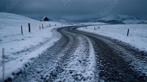 © BROPRADANA, Fototapeta premium Winding snowy country road leading to a small barn