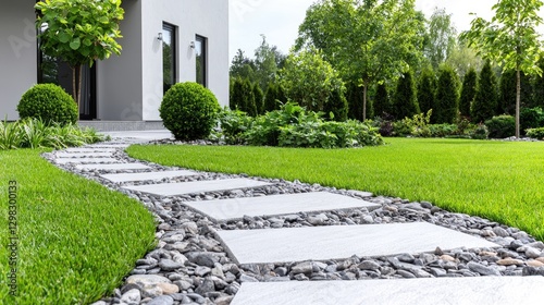 © KIMEHIME, Fototapeta premium Winding stone path garden modern home landscaping design