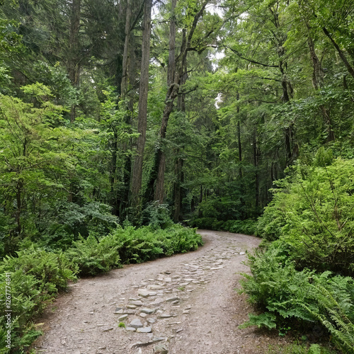 Fototapeta premium winding stone path leads into vibrant, green forest surrounding trees are looking tall and peaceful, natural escape
