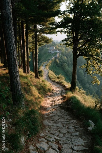 © Naiuang, Obraz premium winding stone path through pine and oak forests near a hilltop fortress