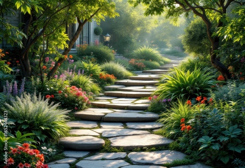© idam, Naklejka premium Winding stone pathway through a vibrant garden.