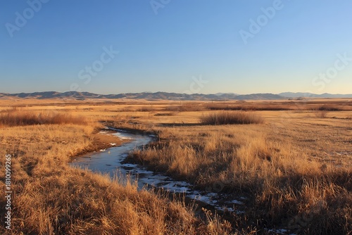 Fototapeta premium Winding stream through golden grasslands under a clear blue sky